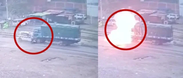 Las imágenes muestran cómo la parte delantera de la vagoneta quedó totalmente incrustada en la carrocería del camión tras el fuerte impacto. Segundos después, se observa una explosión generada por el derrame de combustible, lo que derivó en un incendio que envolvió rápidamente a ambos motorizados.