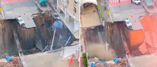 Videos difundidos en redes sociales muestran cómo, al abrirse el terreno, varios postes de electricidad cayeron dentro del foso, mientras que dos tuberías de gran tamaño continuaron vertiendo agua hacia el socavón, lo que facilitó su expansión.