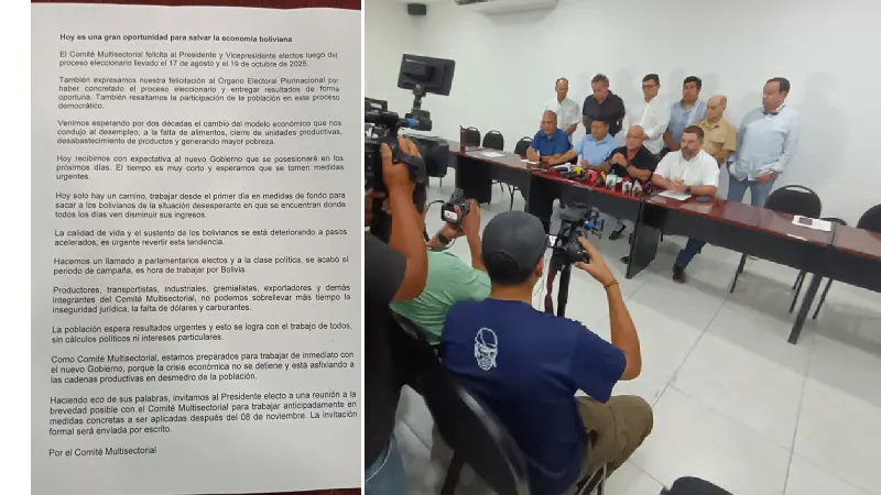 El Comité Multisectorial emitió este lunes un llamado urgente al presidente electo Rodrigo Paz para sostener una reunión a la brevedad posible, con el objetivo de analizar la crítica situación económica que atraviesa el país. En su pronunciamiento, el comité advirtió que la crisis continúa profundizándose y que las cadenas productivas se encuentran asfixiadas, afectando de manera directa la calidad de vida de la población boliviana.