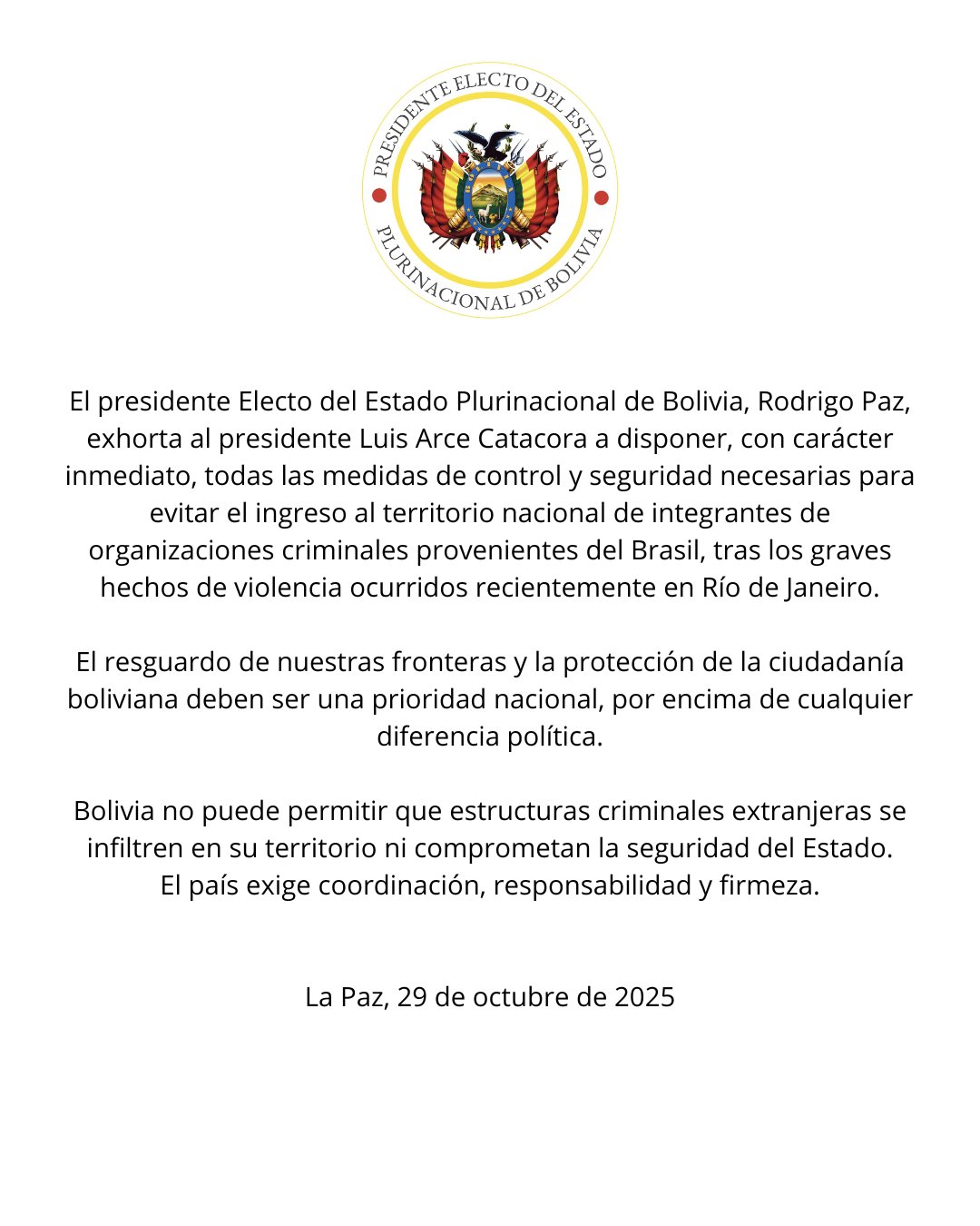 El pronunciamiento de Paz se da un día después del megaoperativo policial y militar ejecutado en Río de Janeiro, en el que se enfrentaron fuerzas de seguridad con el Comando Vermelho, una de las facciones más poderosas del narcotráfico en Brasil. La operación dejó un saldo de al menos 120 personas fallecidas, entre ellas cuatro efectivos uniformados, lo que ha generado preocupación en los países vecinos por una posible dispersión de grupos criminales hacia las fronteras.