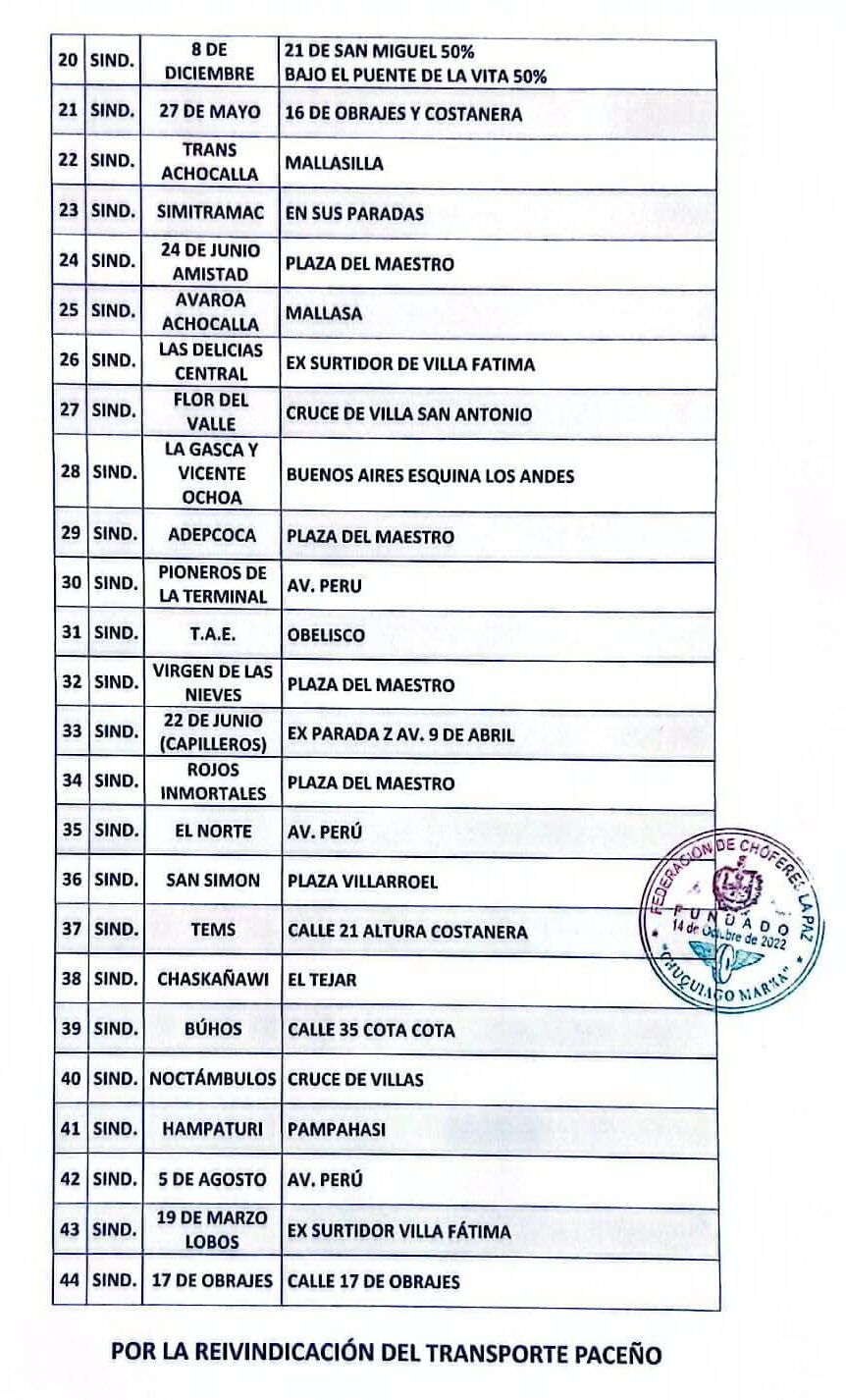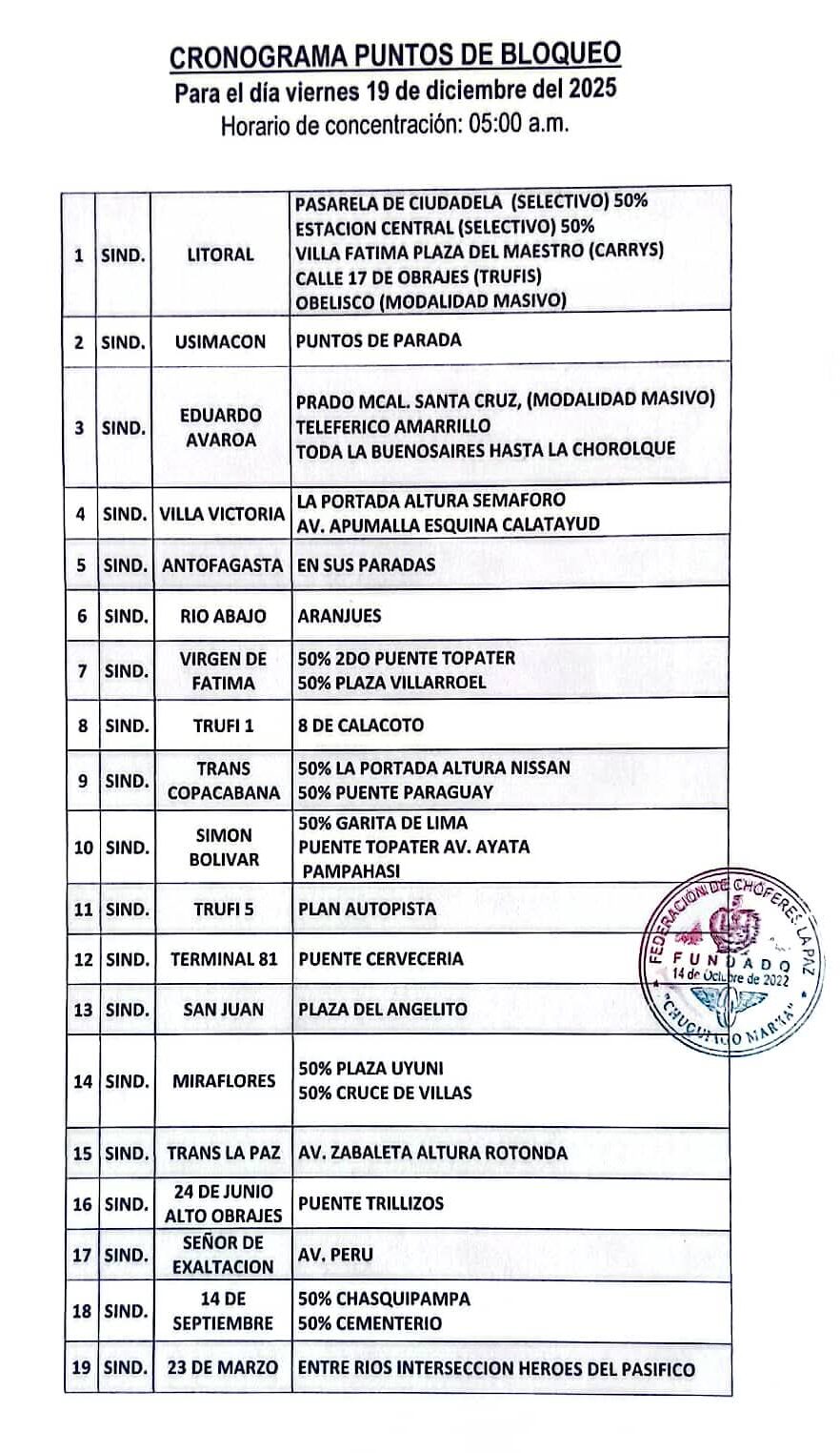 La medida de protesta se desarrollará tanto en la ciudad de La Paz como en las vías interprovinciales, con el objetivo de visibilizar su rechazo a la norma. En ese marco, los dirigentes informaron que se han definido 44 puntos de bloqueo en distintos sectores estratégicos de la urbe paceña, además de la movilización de taxis y minibuses por calles y avenidas, lo que podría generar complicaciones en el tránsito y en las actividades habituales de la población.