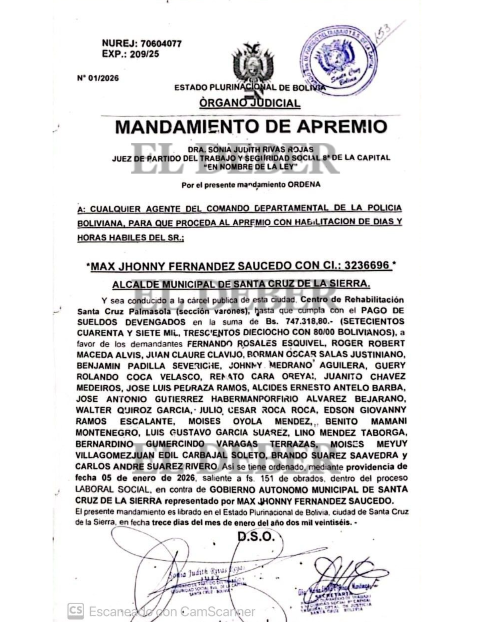 La juez de Partido del Trabajo y Seguridad Social, Sonia Judith Rivas, emitió un mandamiento de apremio contra el alcalde de Santa Cruz de la Sierra, Jhonny Fernández, por el presunto incumplimiento en el pago de sueldos devengados a favor de un grupo de exfuncionarios municipales. La orden judicial establece el ingreso del burgomaestre al penal de Palmasola hasta que se cancele la suma de Bs 747.318,80 correspondiente a salarios adeudados.