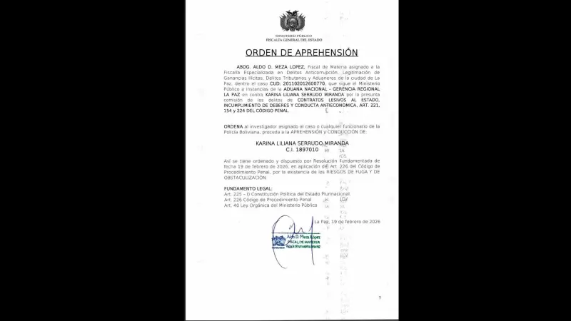 El Ministerio Público emitió este 19 de febrero una orden de aprehensión contra Karina Serrudo Miranda, quien se desempeñó como presidenta ejecutiva de la Aduana Nacional de Bolivia durante la gestión del presidente Luis Arce Catacora.